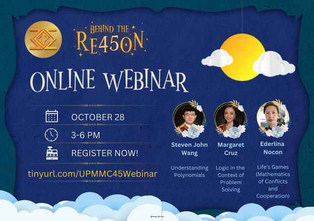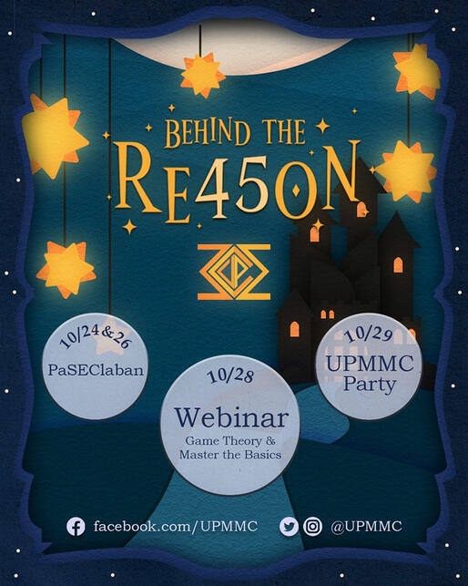 Much like how 45Β° solves sin x = cos x, UPMMCβs 45 years have been equal to sincere service to the students and cosmic efforts to promote mathematics! The reason behind the organizationβs every achievement? Itβs the passionate people who wanted to be part of our family and made it all possible.To our every reason behind, UPMMC dedicates the celebration of its 45th year to creating engaging events for you in this year's UPMMC Week ππππππ πππ ππππππ.Please look forward to our Webinar series: Game Theory & Master the Basics on October 28, 2022!Our dear members can also once again experience whatβs waiting behind this yearβs PaSEClaban and UPMMC Party.#BehindTheRE45ON